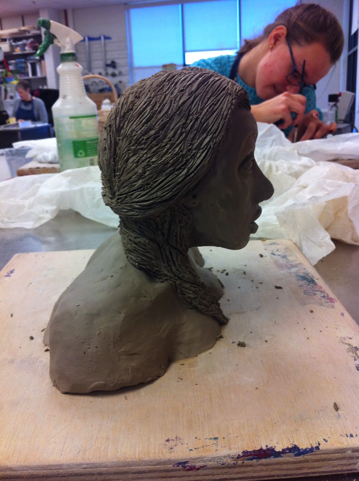 After working for a few hours during an open studio work day on a Saturday, I was able to sculpt her hand and lipstick.